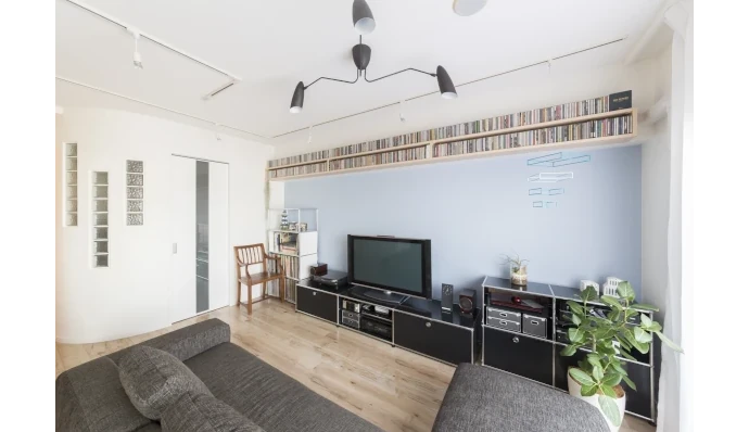 リビング・ダイニングは、奥さまがセレクトされたブルーのアクセントクロスにより爽やかなイメージに。壁の上部には、お気に入りのCDが並べられる棚を造作し、くつろぎながら音楽が楽しめる空間としました。隣接するサービスルーム(納戸)の間仕切り壁はゆるやかな曲面とし、ガラスブロックをはめ込むことで、やわらかで明るい印象を演出しています。