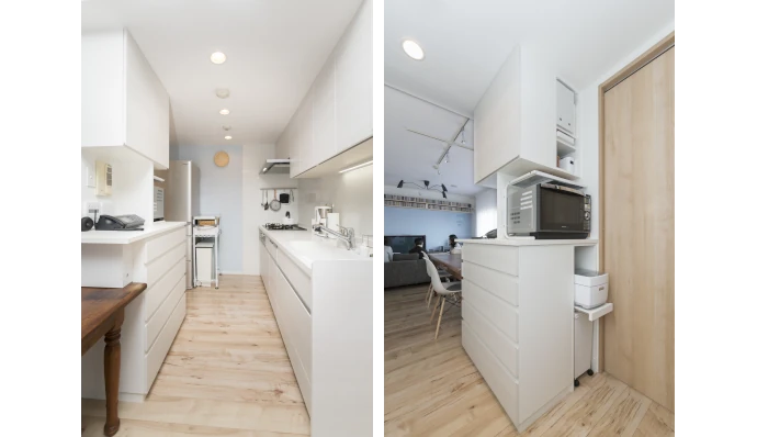 暗かったキッチンは、入り口の両側にあった壁をなくして、明るいオープンキッチンに。また、システムキッチンは向きを90度変え、リビング・ダイニングからも動きやすい動線としました。新設した食器棚は、キッチン家電やごみ箱などをリビング・ダイニングから見えない位置に置けるよう工夫しました。