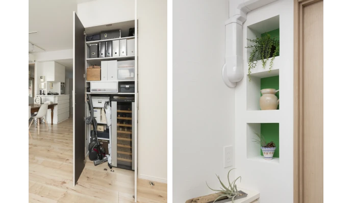 以前は洋室(2)にあった収納を、リビング・ダイニングから使えるように変更しました。市販の収納ボックスに合わせて棚板を設け、使いやすく工夫しました。洗面室のドアの横に設けたニッチ(飾り棚)には観葉植物などを置き、背面のクロスもグリーンとすることで、ゆとりと潤いの感じられる空間となるようにしました。