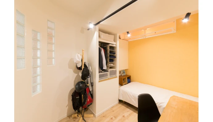 サービスルーム(納戸)は下のお子さまのスペースとして使用されています。窓のないスペースなので明るさが感じられるよう、アクセントクロスは、明るいオレンジを採用。さらに、壁のガラスブロックからはリビング・ダイニングの光をやわらかに取り込むことができます。洋室(1)につながる室内窓を新設し通風も確保。身の回りの物が置けるよう、新たに棚も造作しました。