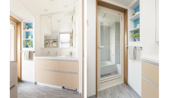 洗面室は、天井まで高さのある二面鏡を備えた洗面化粧台に交換。大きな鏡が空間を広々と見せています。新たに設けたニッチ(飾り棚)の背面のクロスは爽やかなブルー。奥さまお気に入りのポイントとなっています。浴室のドアを透明ガラスとしたことで、ビューバスの光が洗面室に差し込む明るい空間とすることができました。