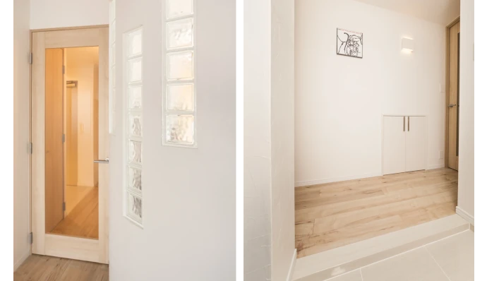 廊下とリビング・ダイニングを仕切るドアにも透明ガラスを採用。廊下・玄関までバルコニーからの明るい光が届きます。スポーツ好きなお子さまが持ち帰った用品をすぐにしまえるよう、玄関の近くに廊下収納を新設しました。