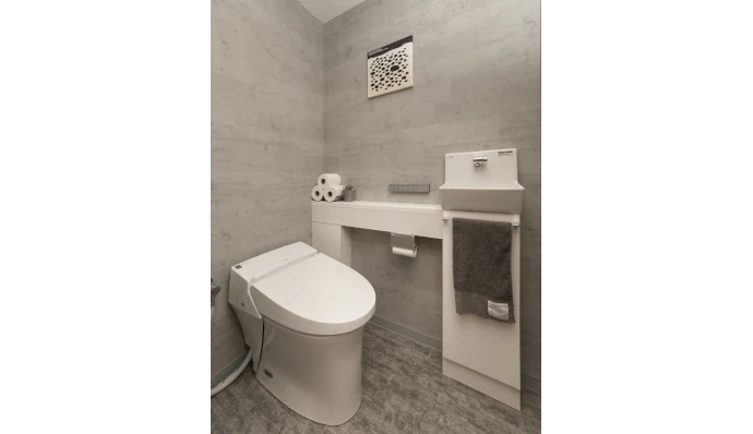 洋室(2)側の壁を移動させて広くしたトイレには、手洗い器付きのカウンターを新設しました。クロスとCFシートには石目調を採用し、落ち着きのある空間としました。