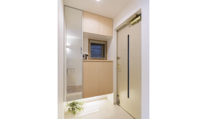 玄関は、従来の下足入れをフロート型に変更しました。下部照明が空間の広がりを演出。トール型収納の建具には、身だしなみの確認に便利な姿見を取り付けました。