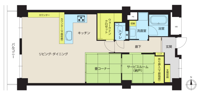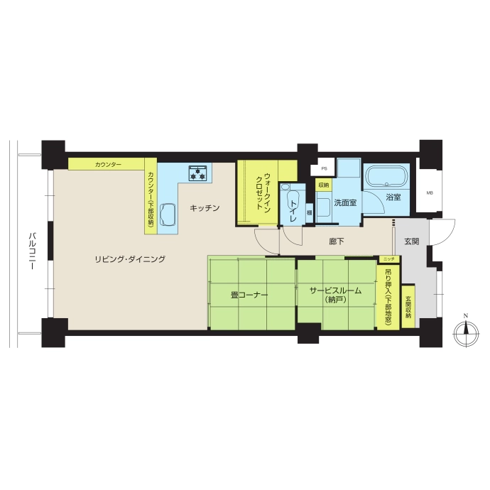 - 玄関収納、ニッチ(飾り棚)、キッチンカウンター収納、畳下収納、カウンター、ウォークインクロゼット、押入、棚