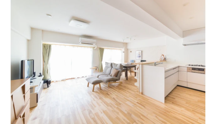 リビング・ダイニングは、バルコニー側にあった和室と洋室を撤去し、キッチンと一続きにすることで、開放感のある空間となりました。白いクロスと無垢材フローリングの木の質感が相まって、自然な風合いの感じられるお部屋となっています。フローリングに採用した無垢のカバザクラ材は、天然素材の蜜蝋で仕上げられています。