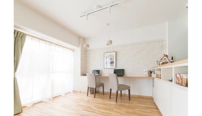 リビング・ダイニングの壁に沿ってカウンターを造作し、ワークスペースとしました。2基のペンダントライトと、壁と柱に張った石目調の調湿建材がアクセントとなっています。