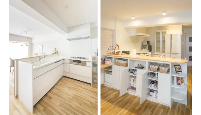 独立型で暗く狭かったキッチンは、広々としたオープンキッチンに変更。新設したカウンターの下部は、食器やリビングの生活用品をすっきりと収納ができる棚にもなっています。