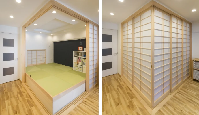 「ごろんと横になれる畳のスペースがほしい」というご要望に応え、リビング・ダイニングの一角に畳コーナーを新設しました。今は赤ちゃんを遊ばせたり休ませたりする場所ですが、障子を閉めれば個室となり、将来は子ども部屋として使うことができます。また、小上がりは、腰を下ろせるベンチとしても使えます。