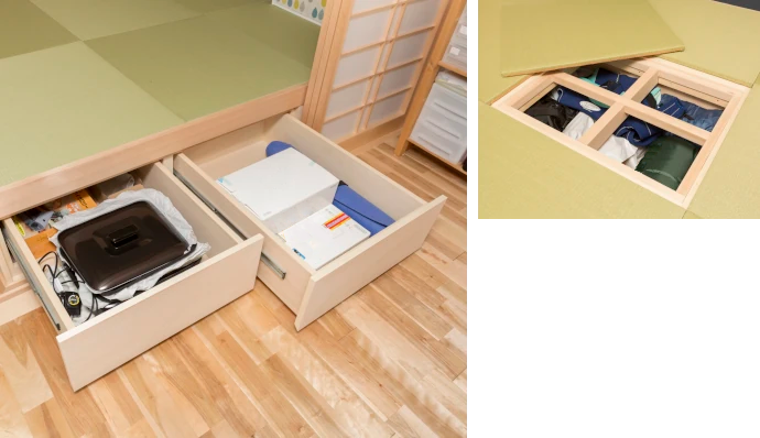 畳コーナーを小上がりにしたのは、畳下収納を設けるためです。小上がりのリビング側に奥行きのある引き出しがあります。中央部にある収納は、格子枠を外して大きな物を入れることもできます。