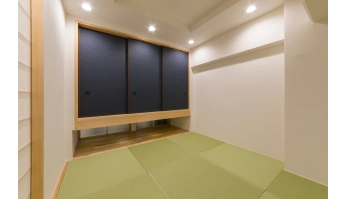 サービスルーム(納戸)は、ご夫妻の寝室として使用するため、布団を収納できる押入を設置。押入の建具の藍色がアクセントとなり、空間を引き締めています。畳コーナーと同様、畳下の中央部は収納としました。換気のため、押入の下部には室内窓(地窓)を設けています。