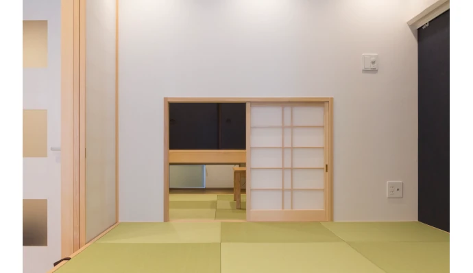 畳コーナーとサービスルーム(納戸)との間には、茶室のにじり口のような障子を設置。隣のサービスルーム(納戸)の室内窓(地窓)を開けることで、風の通り道を確保できます。