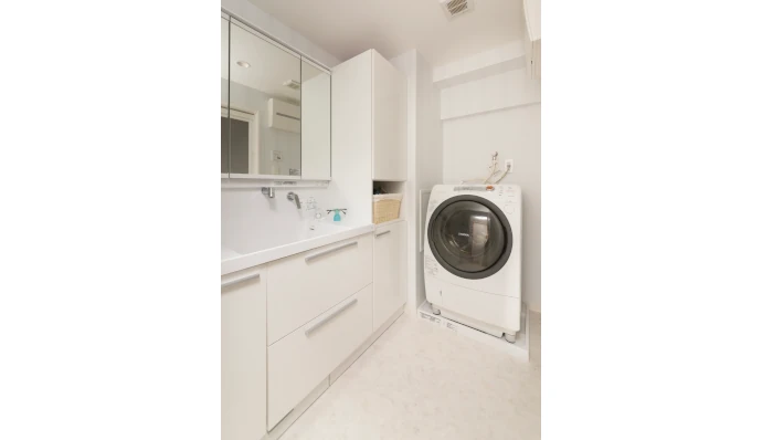 広くなった洗面室は、以前より大きな洗面化粧台やトール型収納を設置することで、十分な収納力を確保しました。