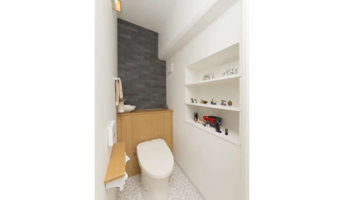 トイレの壁には、アクセントとしてダークな石目調の調湿建材を張りました。梁の下を活用して、ニッチ(飾り棚)を造作。お子さまが喜ぶ人形やおもちゃが並んだ、楽しいスペースとなっています。