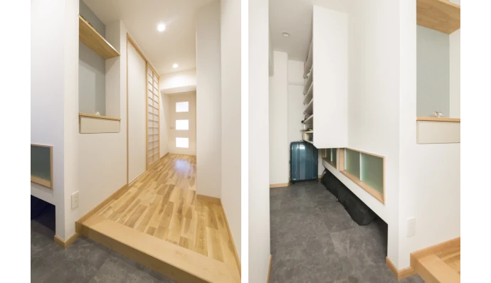 廊下は、リビング・ダイニングやキッチンと同じ無垢材のフローリングで仕上げ、アクセントとしてニッチ(飾り棚)を新設。玄関は、たたきを広げ、ベビーカーやアウトドア用品も置けるようになりました。下足入として新設した可動棚の下部には、サービスルーム(納戸)につながる室内窓を設け、風通しをよくしています。