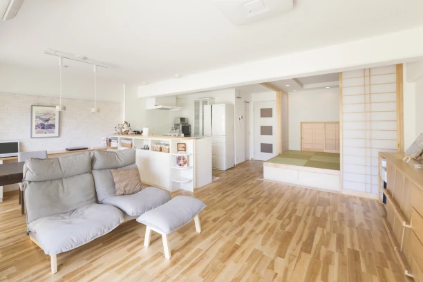 白を基調にナチュラルウッドのフローリングが明るく穏やかな印象を与えるOさま邸。踏み心地がよい無垢材の床や気軽に横になれる畳などは、赤ちゃんがいる家庭なので安全な天然素材を使ってほしいというOさまのこだわりでした。さらに、暗く狭かったリビング・ダイニングやキッチンを明るく広くするため、間取り変更を行うことで開放的な空間を演出。新たに設けた畳コーナーと畳敷のサービスルーム(納戸)には、室内全体の換気を考慮して室内窓を設置しています。また、ウォークインクロゼットや畳下収納の新設により、収納スペースの不足も解消し、親子三人での暮らしが存分に楽しめるお住まいに生まれ変わりました。