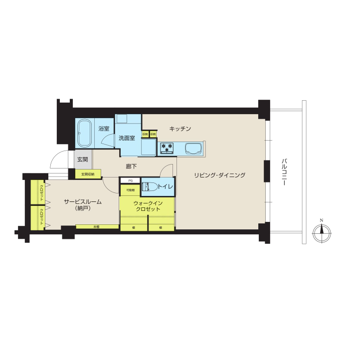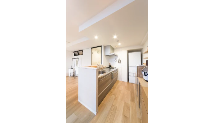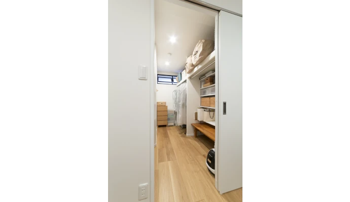 ウォークインクロゼットを新設し、収納⼒を向上させました。さらに、リビング・ダイニングとの壁の上部に室内窓を設け、開けることでサービスルーム(納⼾)のベッドスペースまで風が流れ、室内の空気が循環。こもりがちな空気が⼊れ替わることで、より⼼地よい環境を実現しました。