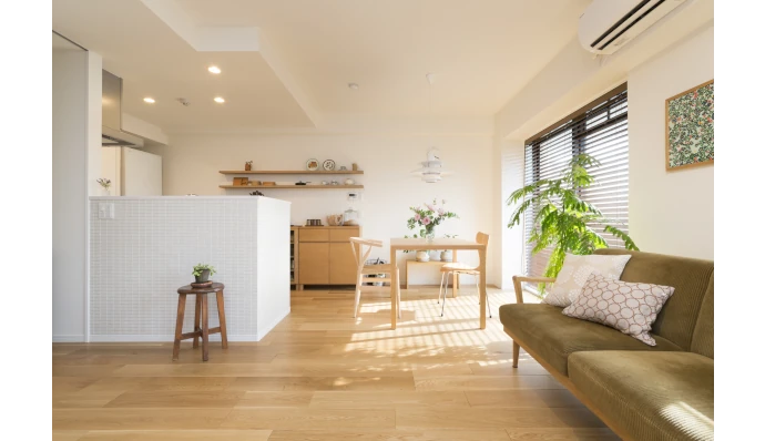 ベランダ側にあった⼆つの和室は⼀続きのリビング・ダイニングにし、⾜触りのよい無垢材のフローリングを採⽤しました。
