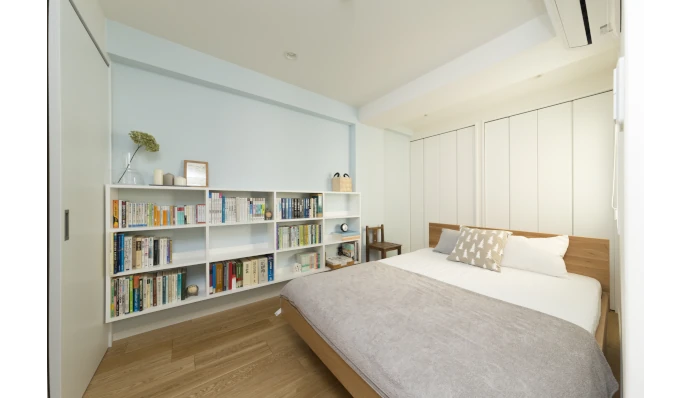 サービスルーム(納⼾)はベッドが置けるスペースとして使⽤できるように広げました。さらに、壁⾯には書籍や⼩物を収納できる便利な棚を造作しました。