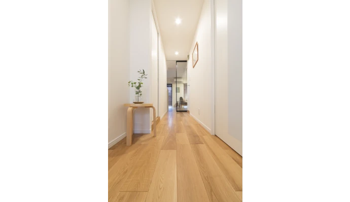 お客さまのご要望をお聞きし、思い描く空間をご提案できたのではないかと思います。明るくナチュラルな雰囲気を⼤切にし、採光を⽣かすためにガラス扉を採⽤し、⽔回りスペースの配置も⼯夫しました。その結果、お客さまにご満⾜いただける仕上がりとなり、私⾃⾝も⼤変嬉しく思っております。