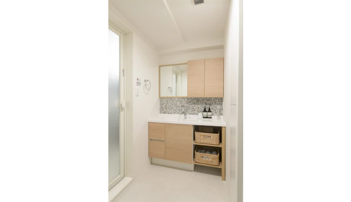 洗⾯化粧台の壁⾯には、奥さまが⼀目で気に⼊られたガラスのモザイクタイルを採⽤しました。華やかで上品なアクセントが加わり、空間に洗練された雰囲気を演出しています。