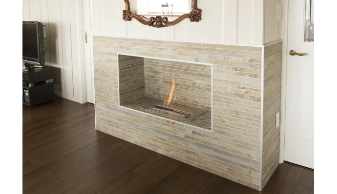 換気設備や煙突が不要で、室内の空気を汚さない暖炉を設置しました。揺らめく炎が⼼を落ち着かせ、穏やかで温もりのある空間になりました。