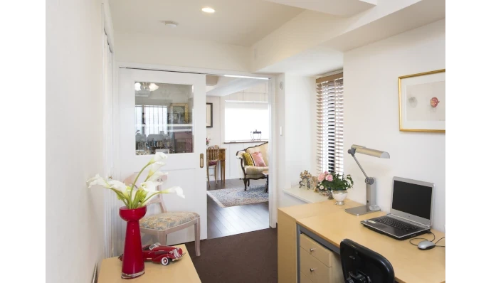 書斎として利⽤されている洋室(2)には、ご主⼈さまと奥さまの仕事⽤デスクが配置されています。2⽅向に窓があり、⾃然光が差し込み、明るく快適な環境になっています。
