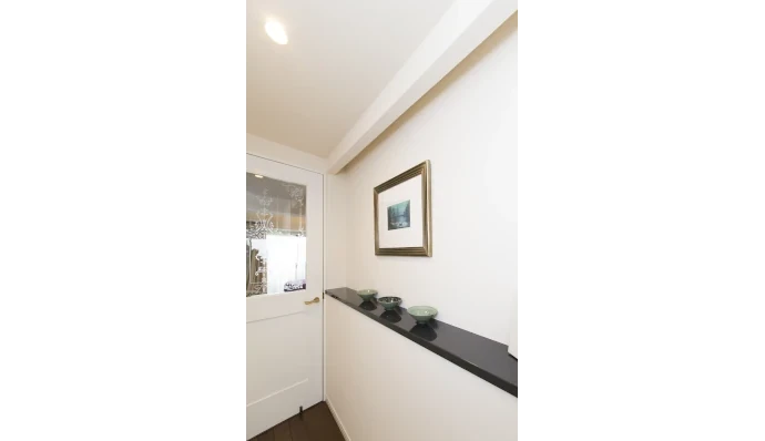 廊下には趣味で集められている⾷器を飾ることができるように飾り棚を設けました。また、壁⾯に絵を飾ることで、魅⼒的なディスプレイ空間になりました。