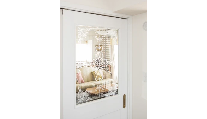 洋室(2)とリビング・ダイニングをつなぐ扉は、奥さまのこだわりが詰まった装飾ガラス⼊りの引き⼾を採⽤しました。⾊合いや素材感を考慮しオフホワイトで塗装することで、空間全体に調和のとれた美しい雰囲気を⽣み出しました。