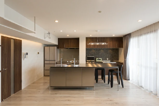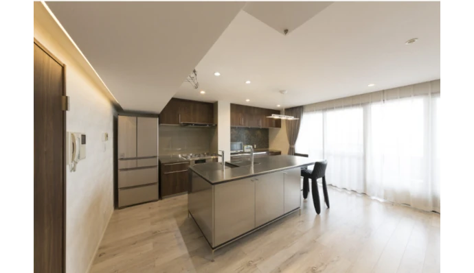 キッチンは、回遊性のある2列型を採⽤することで動線を改善。シンク側にはダイニングテーブルを⼀体化させ、限られた空間を有効に活⽤しました。さらに、ホワイトオークの⽊目調の床材に、コントラストを効かせたダークブラウンの造作家具を組み合わせました。