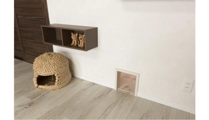 リビングの壁には、キャットスペースへとつながる愛猫⽤の通路を設置。空間のデザインを損なうことなく、愛猫の動線にも配慮した設計となっています。