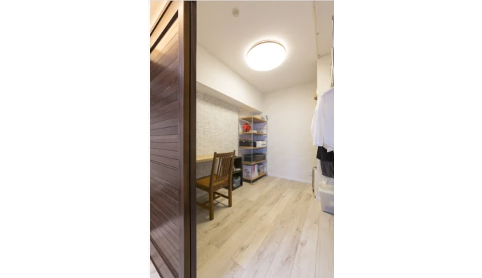 サービスルーム(納⼾)をワークスペースとして活⽤するため、引き⼾には換気と採光に優れたルーバータイプを採⽤。快適に作業ができる空間になりました。