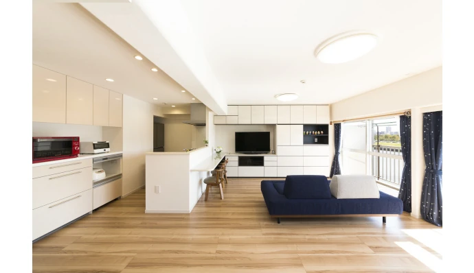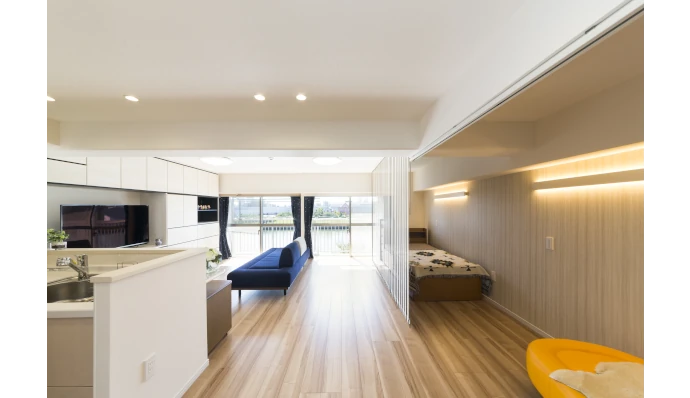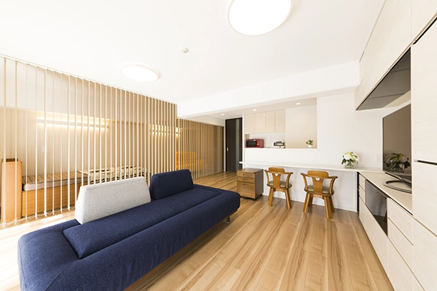 Kさまは、お⼀⼈でお住まいのお部屋をご両親との同居を⾒据え、介護が必要になった際にも安⼼して過ごせ、デザイン性のある内装や間取りにしたいと希望されていました。そこでお住まい全体の動線や間取りを⼯夫し、介護する側とされる側の両⽅が⼼地よい空間となるようご提案をしました。リビング・ダイニングスペースを開け閉め⾃由なバーチカルブラインドで仕切り、ご両親が⽇中にお休みの際も⾒守ることができ、ゆっくり休めるような空間になるようにしました。⽔回りは介助しやすい動線、広さ、設備へ変更。床材も介護施設などでも採⽤されている滑りにくいものを採⽤、廊下や洗⾯化粧台などに⼿すりも配置し、⾃⽴歩⾏をサポートできるようにしました。
