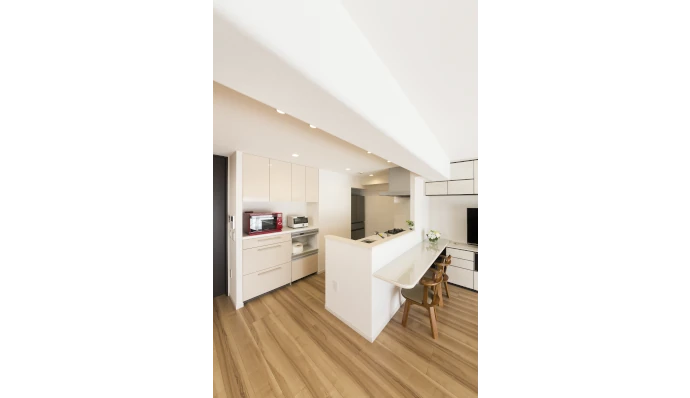 キッチンはオープンキッチンへ変更し、料理をしながらでもご両親の様⼦を⾒守れるように設計しました。さらに、ダイニングテーブルを設けずに⾷事ができるよう、キッチンカウンターを造作。省スペースながら快適に⾷事を楽しめる⼯夫を施しました。