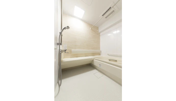 ユニットバスは以前より広いサイズへ変更し、⼊浴時にご両親の⾝体を横から⽀えられる⼗分なスペースを確保しました。さらに、浴槽横にベンチを設置することでゆったりと座ることもでき、介助もしやすい設計となっています。