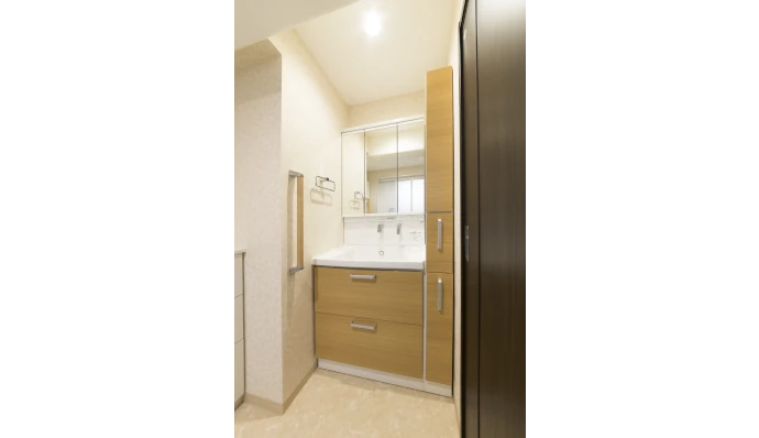 洗⾯室には⼿すりを設置し、より安全で使いやすい環境を整えました。さらに、深いボウルタイプの洗⾯化粧台を採⽤することで、洗い物のしやすさにも配慮。限られたスペースを有効活⽤しました。
