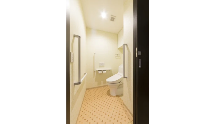 トイレを広げ、引き⼾を採⽤することにより、⾞いすでの移動がスムーズに⾏えるよう配慮しました。また、⼿すりを3カ所に設置することで、安全性を⾼め、⽴ち座りの負担を軽減。快適で使いやすい空間を実現しました。