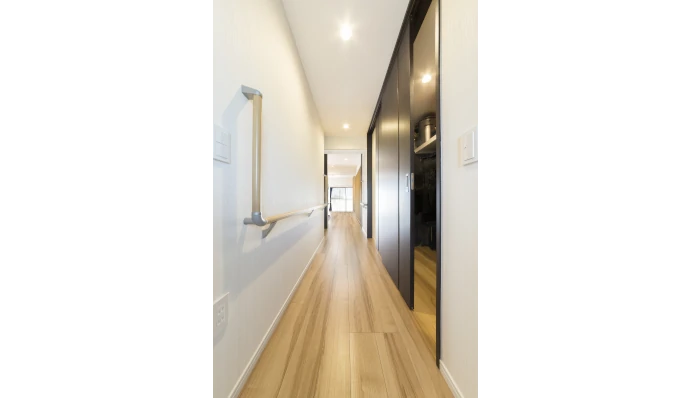 廊下は⼿すりを設置し、滑りにくい床材を採⽤することで、安全に歩⾏できる環境を整えました。
