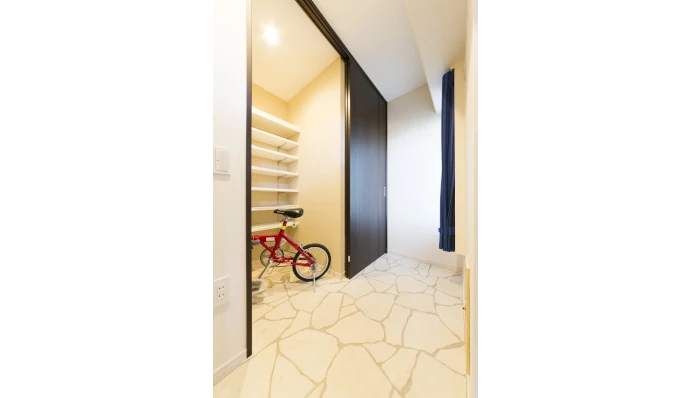 ⽞関横にシューズインクロークを設置。引き⼾で⽞関と廊下を仕切ることができ、北向きの⽞関からの冷気がリビング・ダイニングへ流れ込むのを防ぎます。