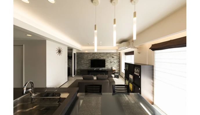 リビング・ダイニングは、バルコニー側にあった洋室を取り込み、明るく広がりのある空間へと⼀新。天井に通っていた排気ダクトは折上げ天井と間接照明で美しくカバーし、空間に奥⾏きとアクセントを加えました。さらに、ご夫婦のパソコン作業や趣味を楽しめるワークスペースもさりげなく配置し、デザイン性と実⽤性を両⽴したくつろぎの空間に仕上がっています。