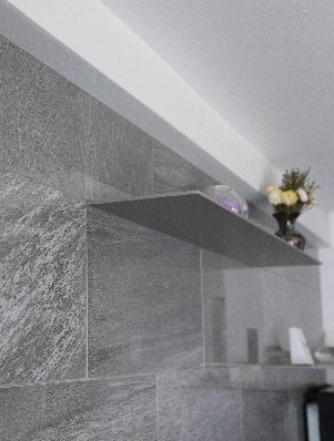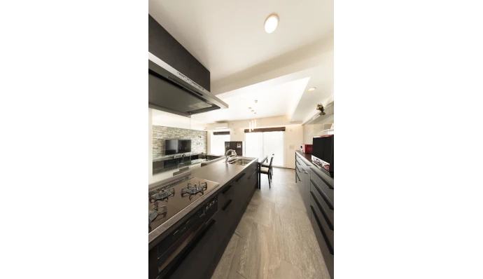 キッチンの壁⾯には、⽯柄のタイルを採⽤。鏡⾯仕上げで、⾒た目の魅⼒だけでなく、⽇々の拭き掃除もしやすい機能性の⾼い仕上がりとなっています。