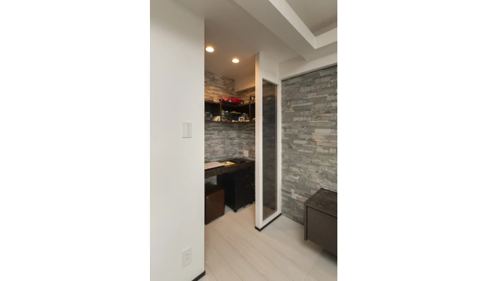 リビングの⼀角には、元々のウォークインクロゼットのスペースを活⽤して、ご夫婦のパソコン作業や趣味を楽しめるワークスペースを設置。⽣活空間と程よく距離を取りながらも、LDKの中に⾃然に溶け込む、落ち着きのある居場所としてプランニングしました。視線や動線を意識したつくりで、趣味や作業に集中できる空間となりました。