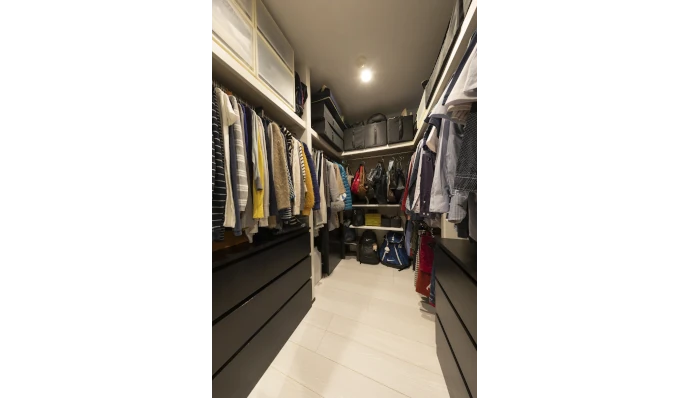 ウォークインクロゼットは寝室の正⾯に配置されており、Oさまご夫婦は朝起きてそのまま中に⼊り、⾝⽀度を整えるのが⽇課だそうです。季節ごとの⾐類はもちろん、旅⾏⽤品までたっぷり収納できる、使い勝⼿のよい収納空間となっています。