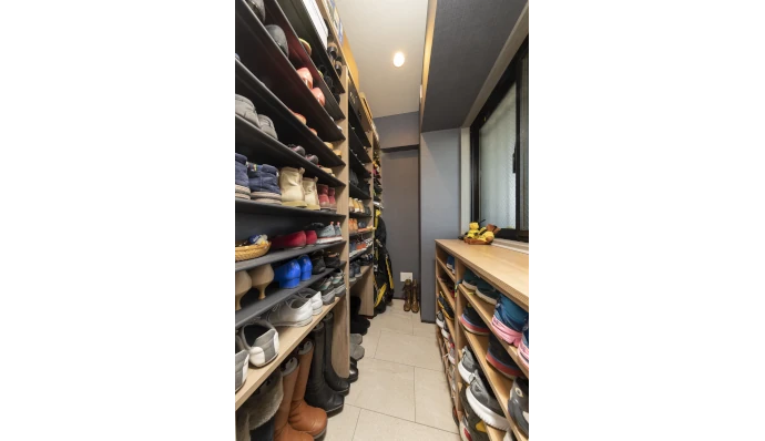 ⽞関から直接アクセスできるシューズインクロークには、靴のほかスポーツ⽤具などもスッキリ収納。さらに、ウォークインクロゼットとの間に室内窓を設けることで、通気性がよく快適な空間を維持できるよう⼯夫しました。
