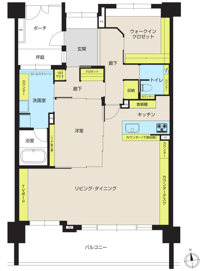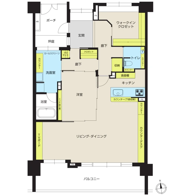 - ウォークインクロゼット、TVボード、⾷器棚、ニッチ(飾り棚)、廊下収納、洗⾯室収納、トイレ収納、カウンターデスク、カウンター
