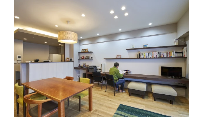 リビング・ダイニングの壁⾯には、⻑さ4m以上のカウンターデスクを設置。趣味の作業スペースにも使⽤することができ、どこに座ってもゆったりと使⽤できる快適な空間となっています。
