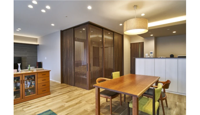 就寝スペースとリビング・ダイニングの間には、デザイン性のある縦格⼦の引き⼾を設置。引き⼾は全閉から全開まで⾃由に開閉できるため、シーンに応じて空間の使い⽅を柔軟に調整可能。開放感を楽しみたいときは扉を開き、プライベートな空間を確保したいときは閉じるなど、暮らしのスタイルに合わせた活⽤ができます。