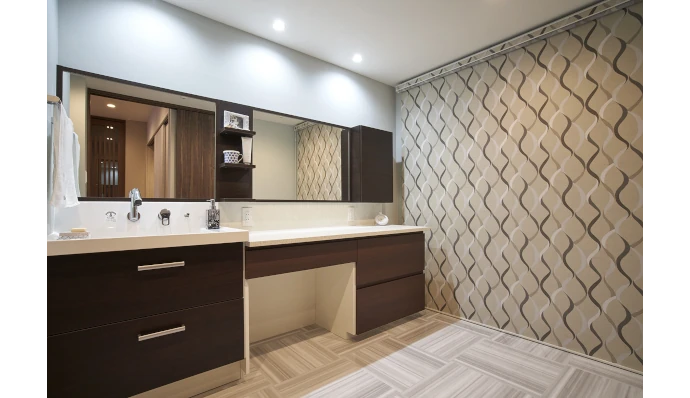 就寝スペースのベッド脇から直接出⼊りできる、ゆとりのある洗⾯室。広いカウンターを備え、化粧や⾝⽀度を快適に⾏える機能的な空間となっています。