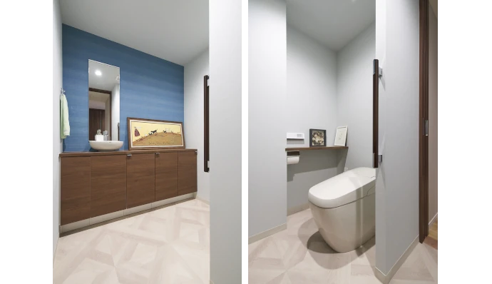 トイレ内の⼿洗いカウンターまわりは、⾞いすでも快適に通れる⼗分な広さを確保。引き⼾を開けても廊下側から便器が直接⾒えないよう配置を⼯夫しました。