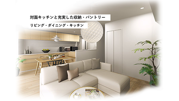 キッチンからパントリー、廊下へ抜ける回遊動線で家事効率アップ。収納力も充実し、家族の暮らしにゆとりを生む住まい。ライフスタイルや家族構成に合わせて、3LDKなどの別プランのご提案も可能です。